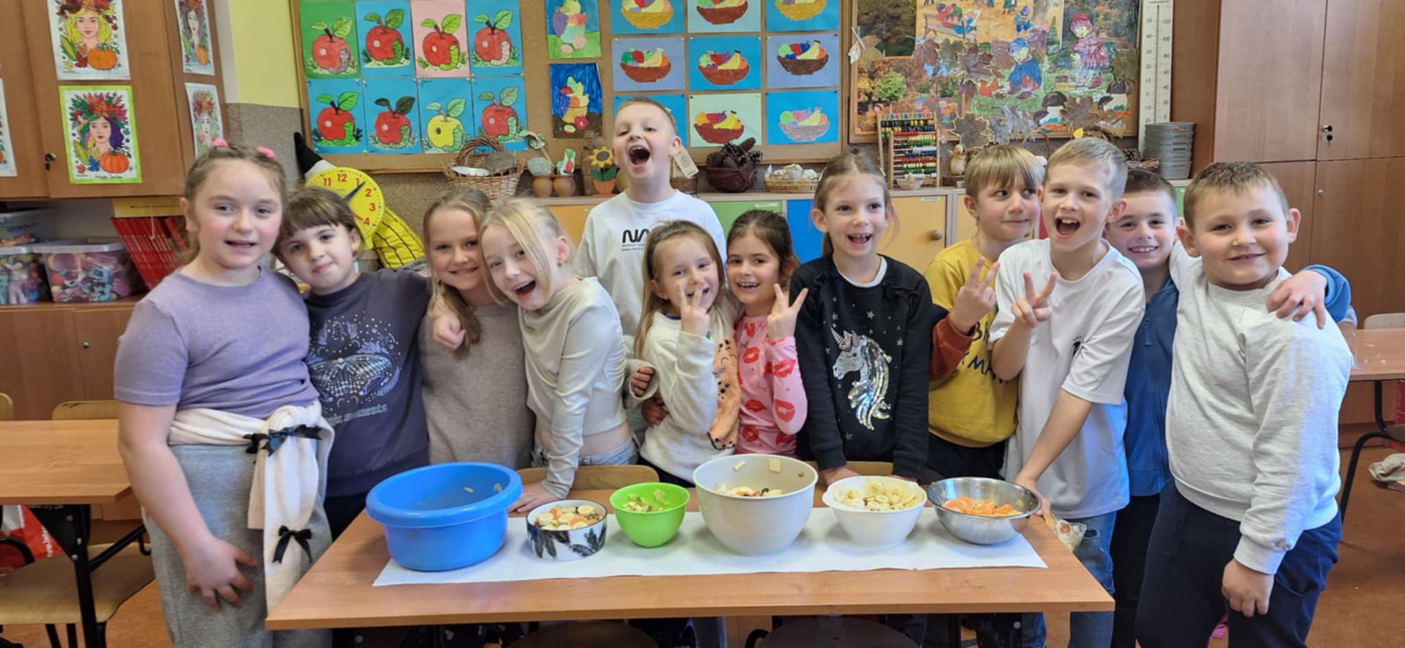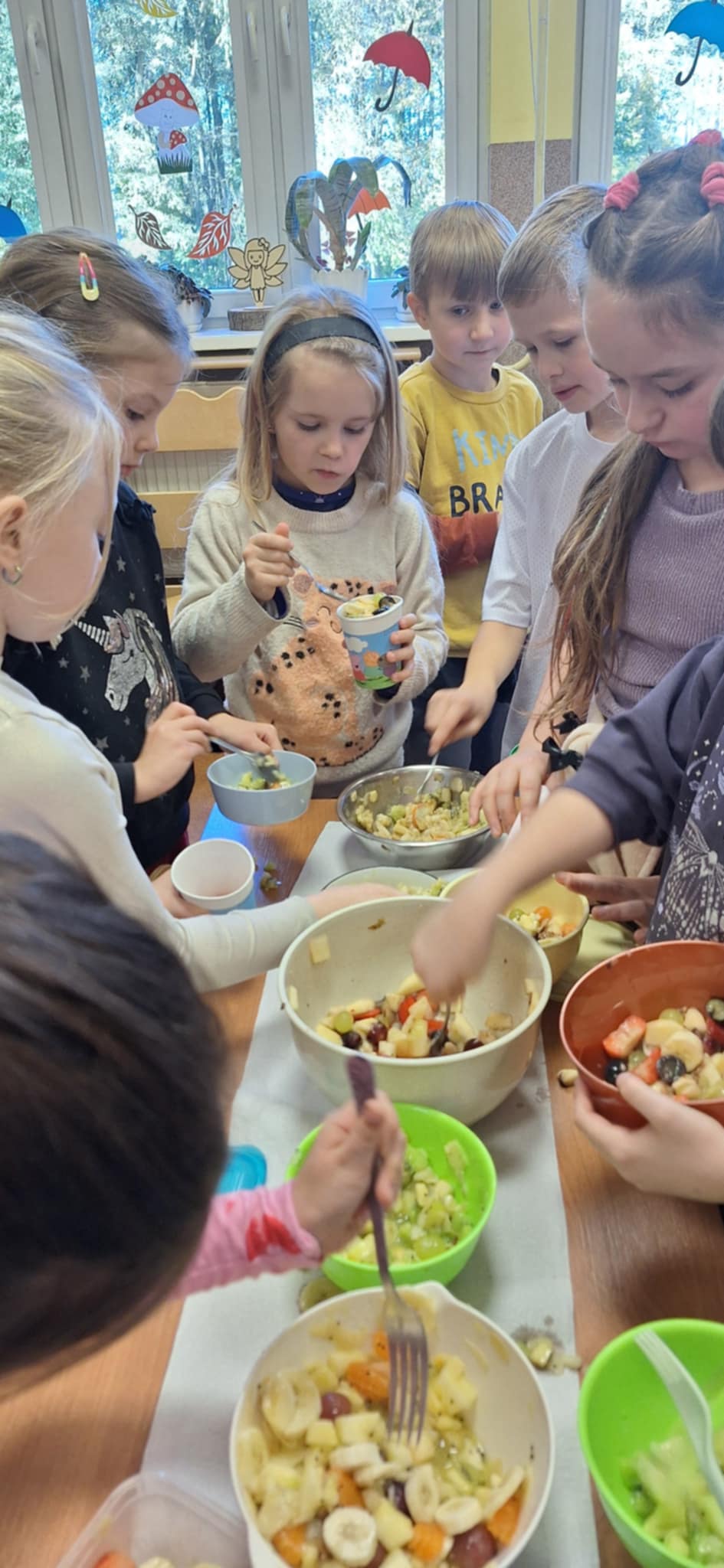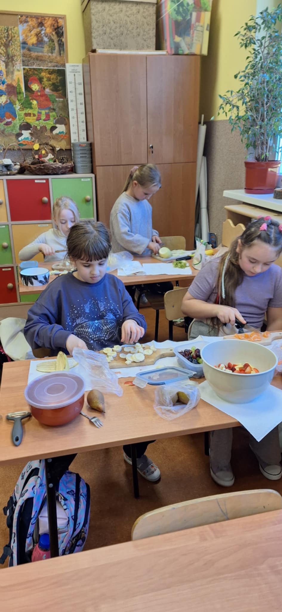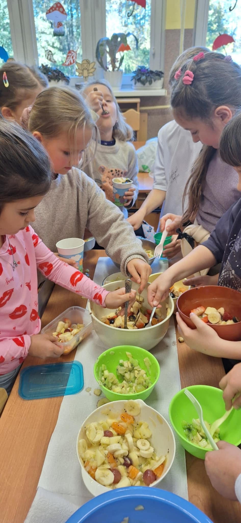 20 października odbyły się w kl II b następne praktyczne zajęcia ze zdrowego żywienia. Dzieci pracowały w grupach i uczyły się samodzielnego wykonania sałatki owocowej Dania wyszły pyszne, kolorowe i bardzo witaminowe. Taka przekąska jest alternatywą dla słodyczy. Dzieci uczyły się sztuki obierania i krojenia owoców. Degustacja przygotowanych sałatek była bardzo przyjemna. Dzieci stwierdziły, że będą robiły takie sałatki w domu.