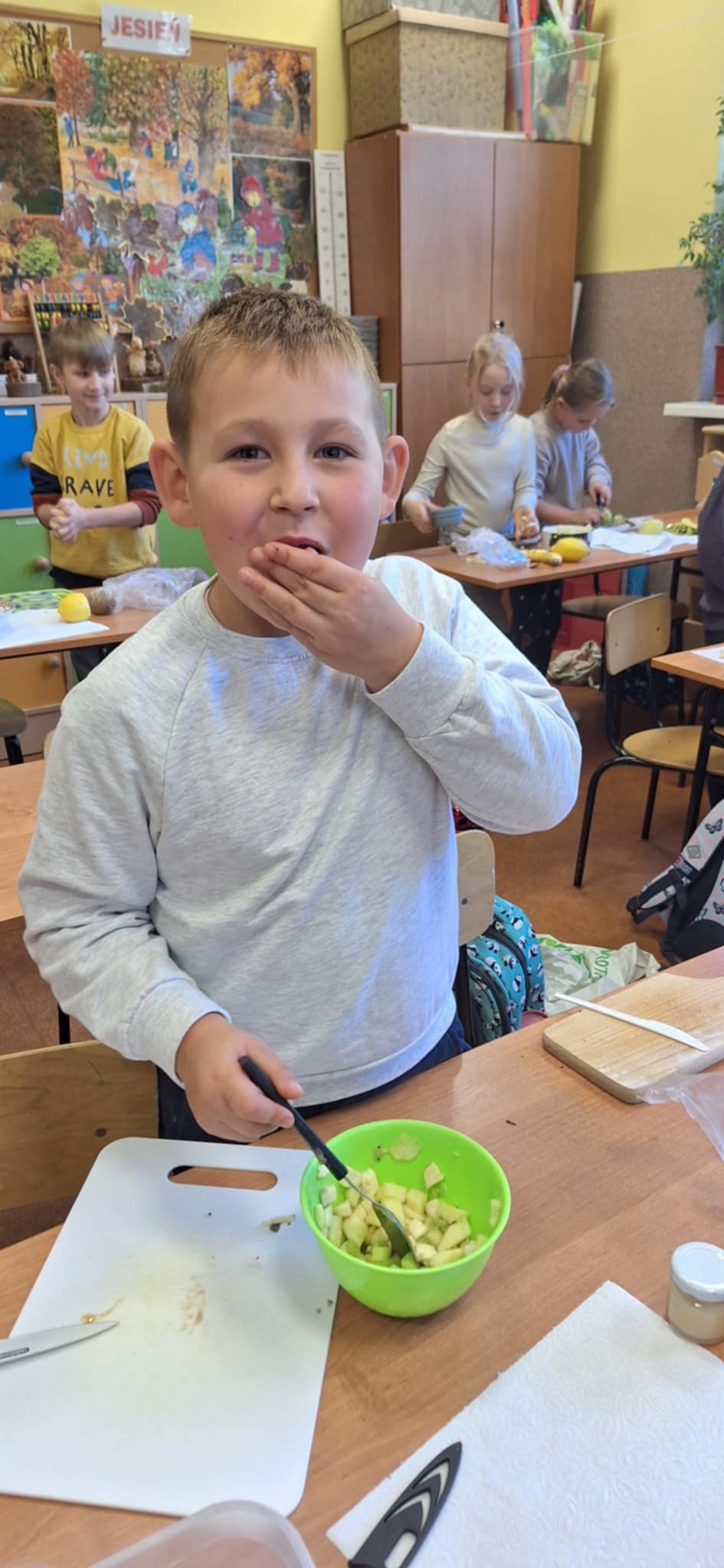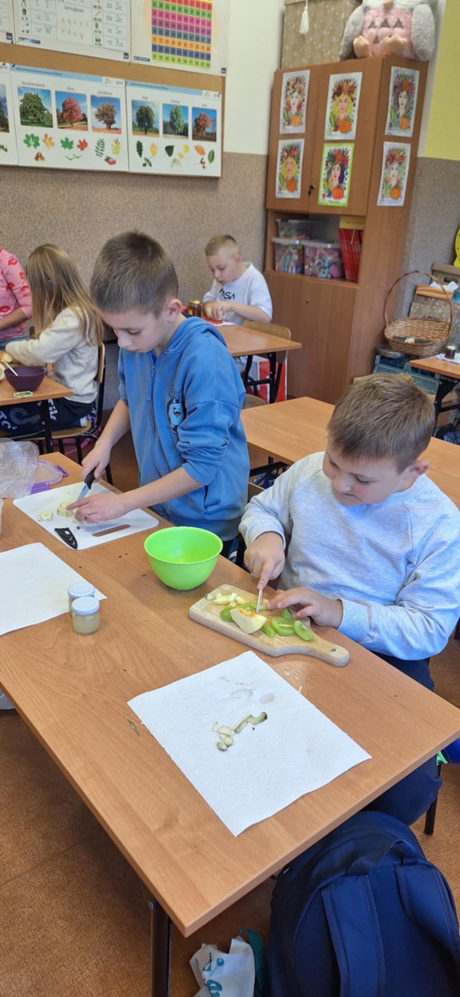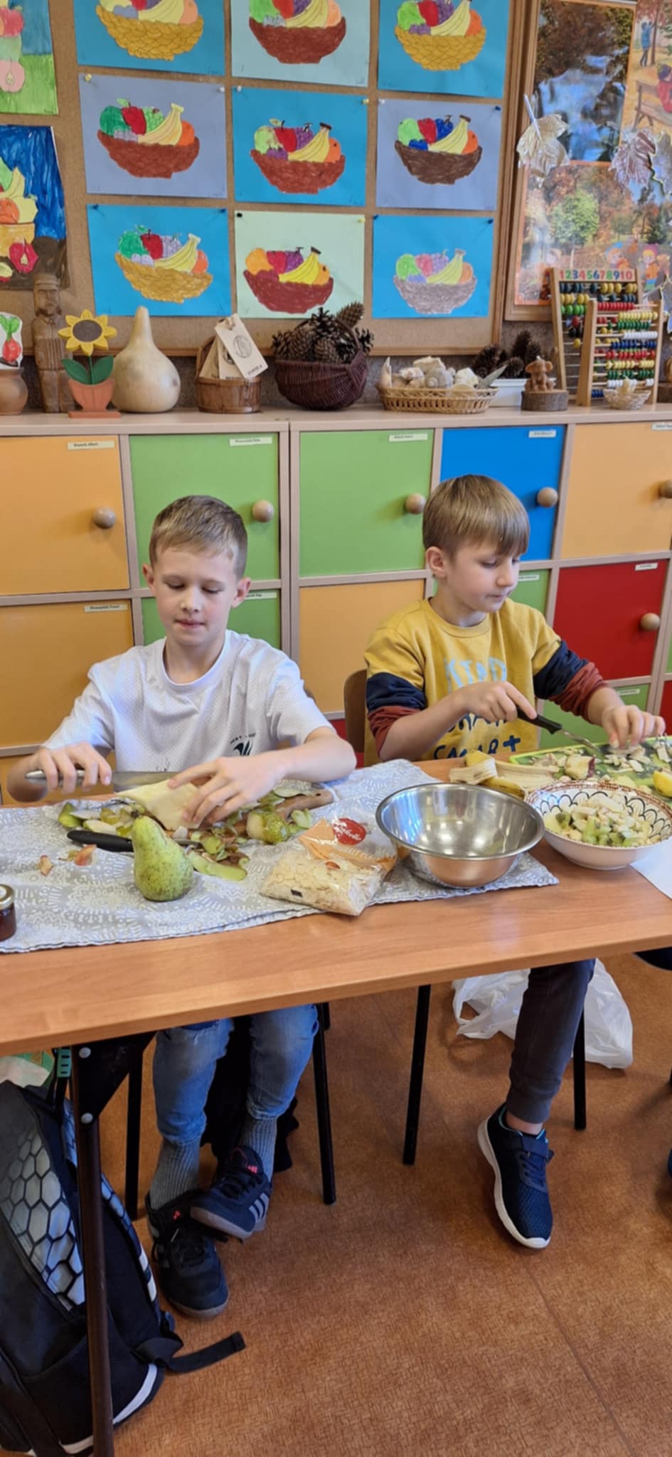 20 października odbyły się w kl II b następne praktyczne zajęcia ze zdrowego żywienia. Dzieci pracowały w grupach i uczyły się samodzielnego wykonania sałatki owocowej Dania wyszły pyszne, kolorowe i bardzo witaminowe. Taka przekąska jest alternatywą dla słodyczy. Dzieci uczyły się sztuki obierania i krojenia owoców. Degustacja przygotowanych sałatek była bardzo przyjemna. Dzieci stwierdziły, że będą robiły takie sałatki w domu.