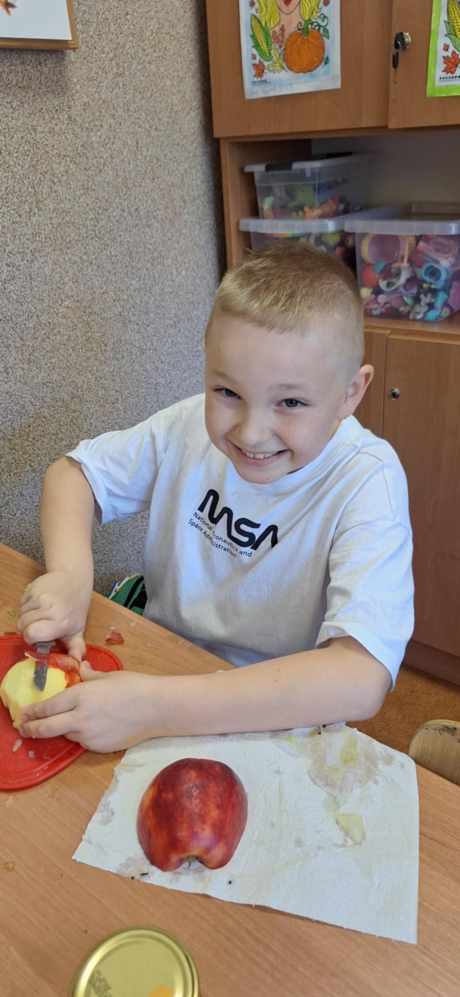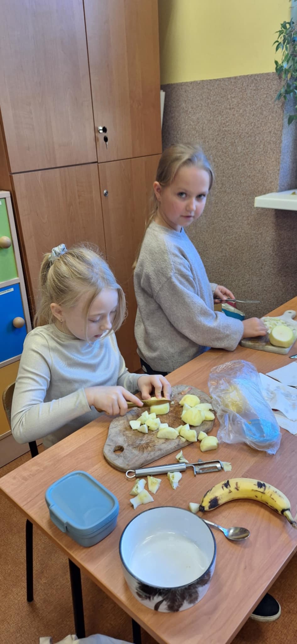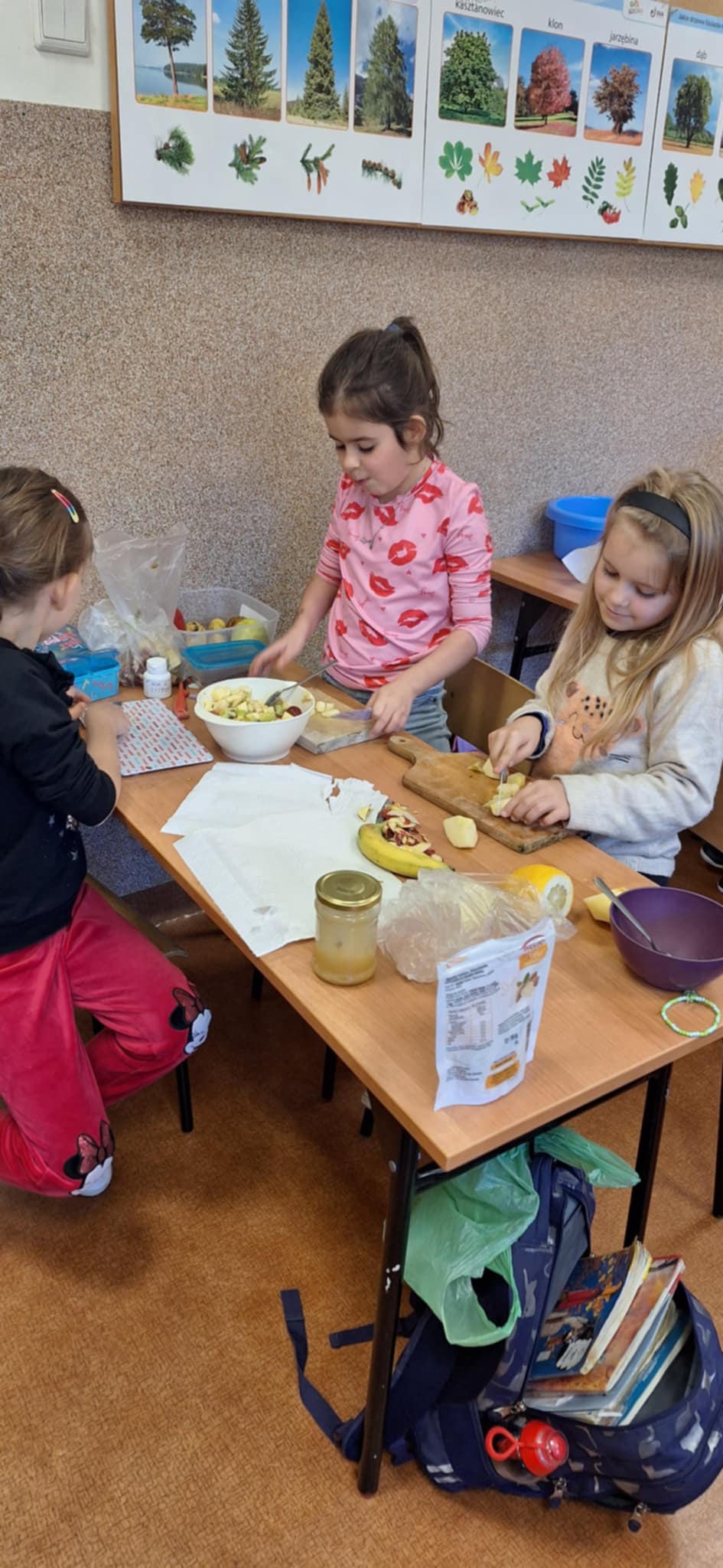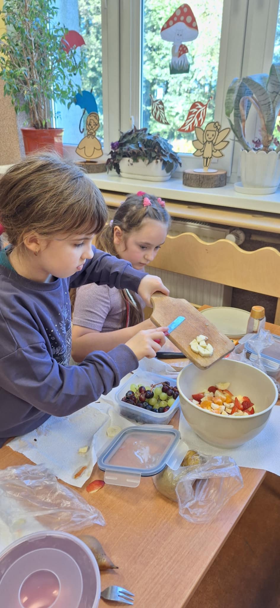 20 października odbyły się w kl II b następne praktyczne zajęcia ze zdrowego żywienia. Dzieci pracowały w grupach i uczyły się samodzielnego wykonania sałatki owocowej Dania wyszły pyszne, kolorowe i bardzo witaminowe. Taka przekąska jest alternatywą dla słodyczy. Dzieci uczyły się sztuki obierania i krojenia owoców. Degustacja przygotowanych sałatek była bardzo przyjemna. Dzieci stwierdziły, że będą robiły takie sałatki w domu.