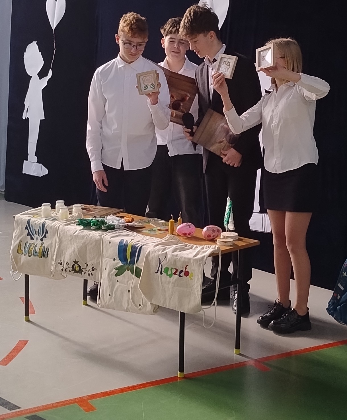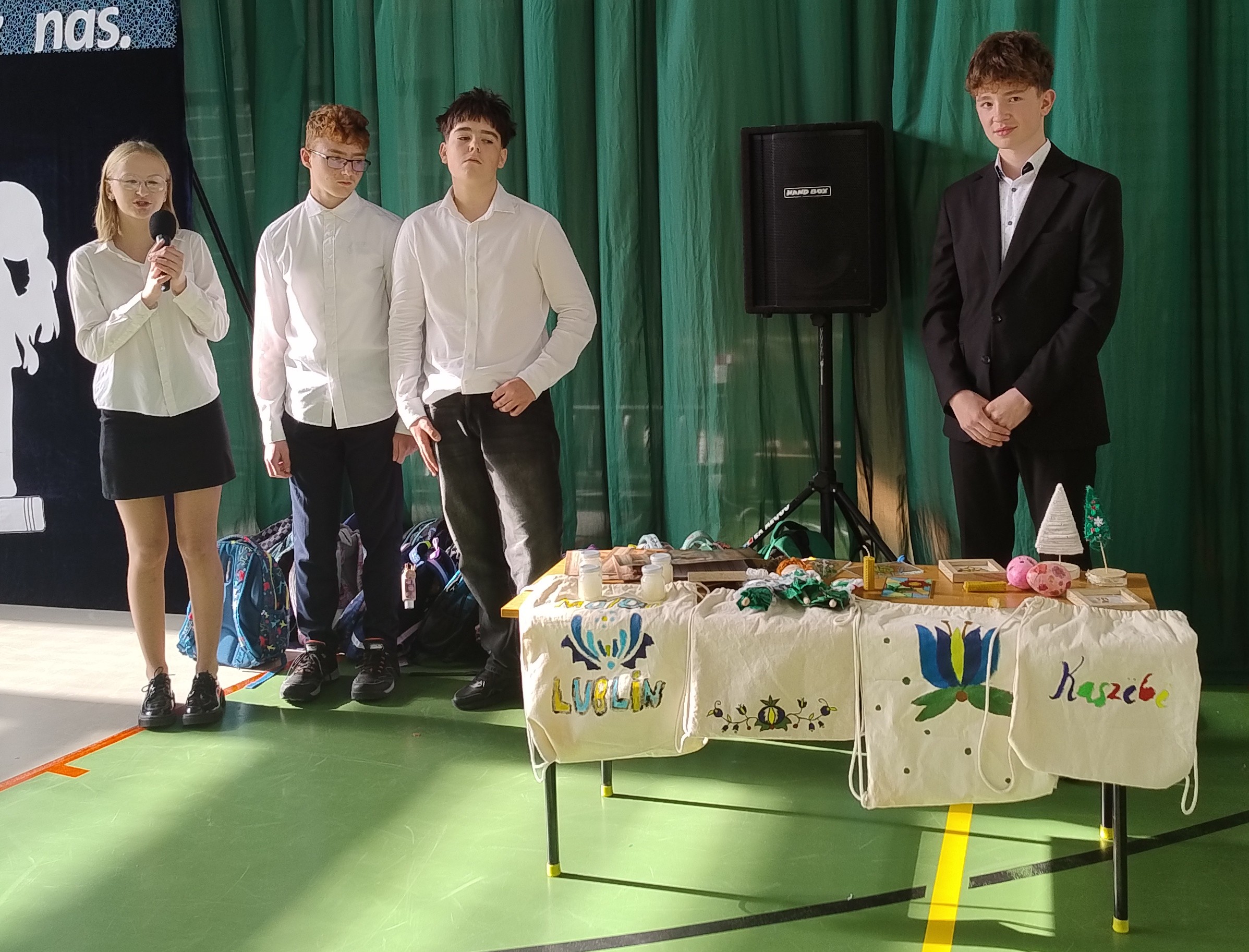 16 października uczniowie klasy VIII biorący udział w projekcie "Kalendarz tradycji: polsko-ukraińska podróż przez święta i zwyczaje" podzielili się z uczniami i nauczycielami wrażeniami z pobytu w Chojnicach, opowiedzieli o warsztatach, zajęciach i spotkaniach, w których brali udział. Zaprezentowali też efekty swojej pracy – rękodzieło, w skład którego weszły: lalki w kaszubskich strojach, obrazki malowane na szkle, torby z wzorami haftu kaszubskiego, kaszubskie smużki, sole do kąpieli, haft krzyżykowy, choinki z włóczki oraz jajka wielkanocne zdobione techniką decoupage.